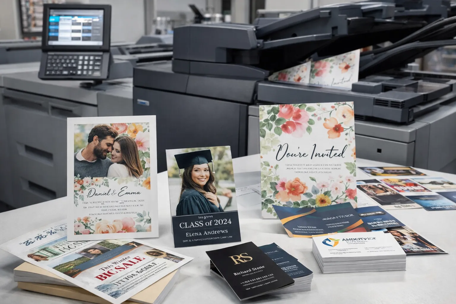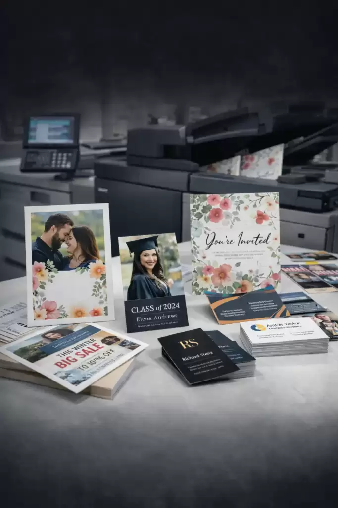 Vizitkarta, ftesa, broshura dhe materiale promocionale me cilësi të lartë dhe ngjyra të pastra profesionale.